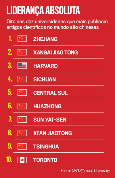 Segundo um novo ranking elaborado pela Universidade de Leiden, na Holanda, centrado na quantidade e na importância de pesquisas publicadas, o tabuleiro da geopolítica do saber deu uma sacudida: a China passou a ocupar oito das dez primeiras colocações, emplacando as universidades de Zhejiang e Xangai Jiao Tong como campeã e vice, respectivamente, no rol em que a prestigiada Harvard, dos Estados Unidos, surge em terceiro lugar (veja no quadro).