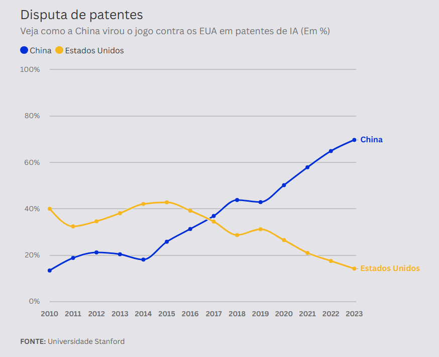 Na prática, os EUA ainda são líderes na área. Mas em 2023, quase 70% das patentes registradas e 86% das pesquisas científicas publicadas sobre IA foram chinesas, um domínio em pesquisa e inovação que aconteceu ao longo da década de 2010.
