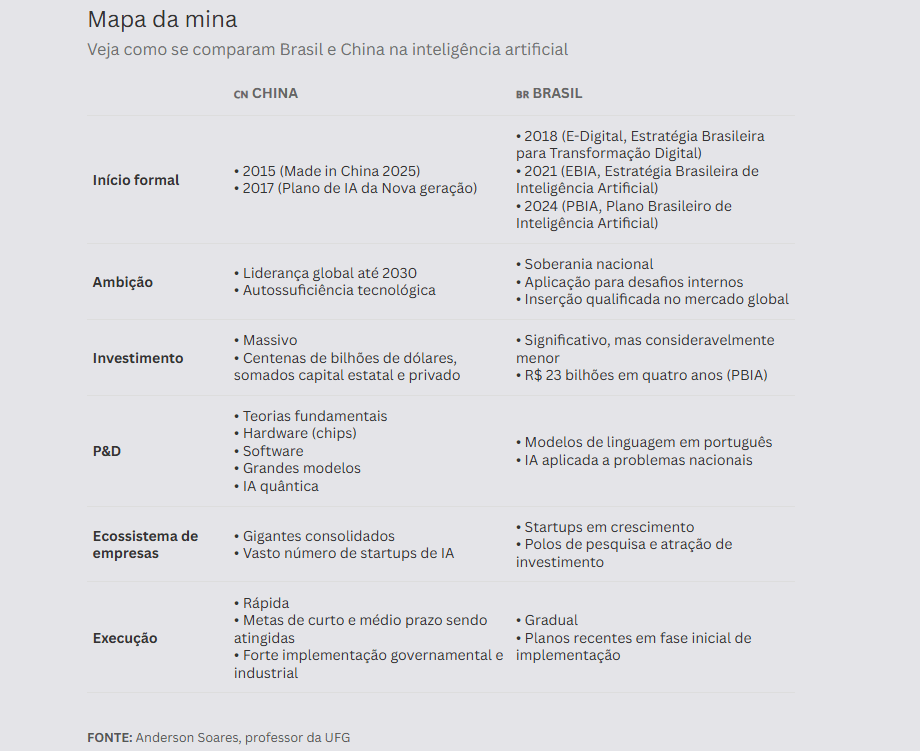 “Mas não é só um plano topdown, você tem o governo estabelecendo prioridades e dando estímulos financeiros para que essas prioridades sejam alcançadas, e também empresas que competem entre si por inovação em um ecossistema que é brutal”, diz Claudia Trevisan, diretora executiva do Conselho Empresarial Brasil-China. Neste sentido, o investimento privado chinês em IA somou US$ 119 bilhões entre 2013 e 2023, segundo o The AI Index Report de 2025, de Stanford. No mesmo período, o Brasil somou US$ 2 bilhões em investimento privado em IA, montante semelhante ao de Áustria, Argentina e Irlanda.