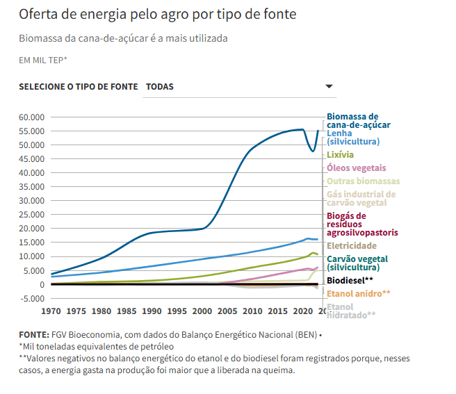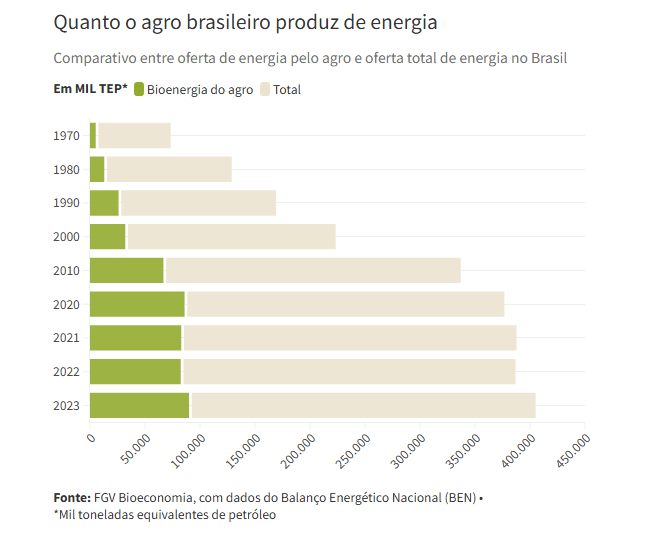 Desde o início da década de 1970, período que antecedeu o lançamento do Proálcool, a trajetória da bioenergia gerada pelo agro tem sido de ascensão contínua: passou de 6,5 milhões de toneladas equivalentes de petróleo (TEP) – unidade usada para comparar diferentes fontes de energia com base no poder calorífico do petróleo — para mais de 91 milhões em 2023. De acordo com Luciano Rodrigues, um dos autores da pesquisa, isso contribui para que o Brasil tenha uma das matrizes energéticas mais renováveis do mundo.