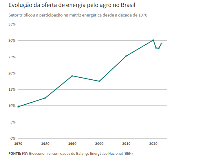 A participação do agronegócio na matriz energética brasileira já representa quase um terço de toda a energia ofertada no País. Segundo estudo do Observatório de Bioeconomia da Fundação Getulio Vargas (FGV), divulgado em maio com base no Balanço Energético Nacional (BEN), recursos oriundos de atividades agropecuárias foram responsáveis por 29,1% da energia usada no Brasil em 2023. Entre as principais fontes estão a biomassa da cana-de-açúcar, o etanol e o biodiesel.