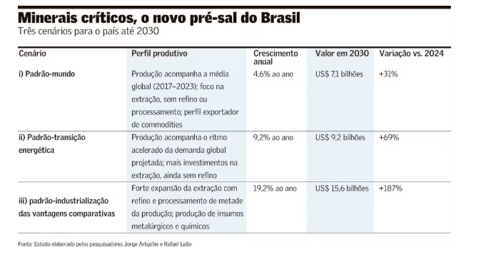 No cenário “padrão-mundo” estimado no estudo, os pesquisadores consideram que a produção brasileira se equipara à velocidade média global observada entre 2017 e 2023, mas o país permanece concentrado na extração, sem capacidade relevante de refino e processamento, mantendo um perfil essencialmente exportador de commodities minerais. Nesse cenário, o valor da produção mineral beneficiada de cobre, grafita, manganês, níquel, terras raras e lítio cresce 4,6% ao ano, até 2030, alcançando US$ 7,1 bilhões, ante US$ 5,4 bilhões em 2024, o que representa alta de 31% (a um câmbio médio de R$ 5,5 por dólar).