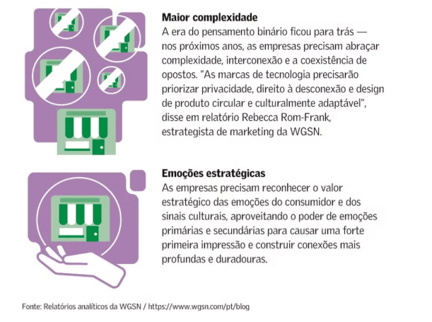 “Em um mundo conectado, os maiores disruptores podem ser as coisas que nos reconectam com o que podemos ver, cheirar, ouvir, saborear e tocar”, informou o material que suportou a apresentação. A WGSN cita a superexposição a estímulos que os compradores vivem hoje, o que tende a levar à fadiga digital, e diz que isso pode dar lugar à apatia emocional dos consumidores.