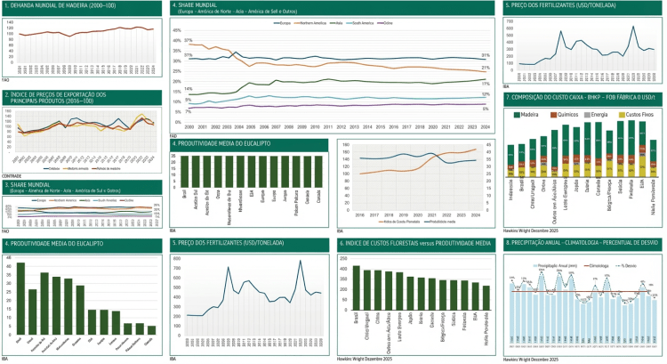 O Brasil ainda é líder mundial em produtividade de florestas plantadas de eucalipto, com médias de 30–45 m³/ha/ano em muitas regiões. Mas os custos da terra, logísticos e operacionais têm reduzido essa vantagem quando somos comparados com outros países produtores, principalmente em alguns países da Ásia.