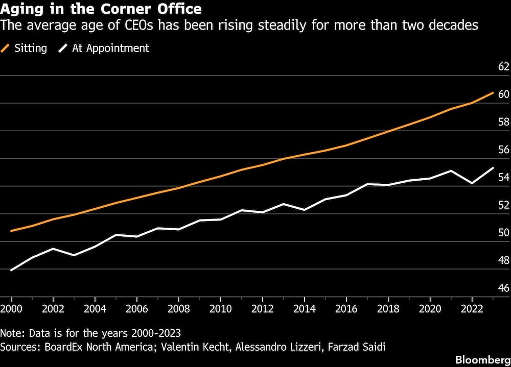 Os CEOs nos Estados Unidos agora têm em média 61 anos — dez anos a mais do que em 2000. O tempo de mandato e a aposentadoria cada vez mais tardia são apenas parte da explicação. Os executivos assumem o cargo máximo cada vez mais tarde. A idade média na nomeação é agora de 55 anos, ante pouco menos de 48 anos em 2000.