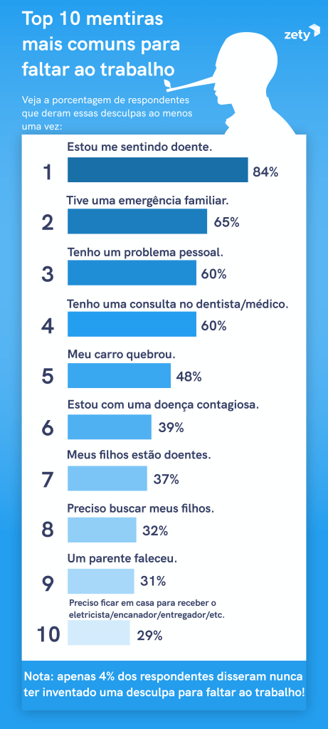 Essa é uma das revelações da pesquisa organizada pelo Zety, site de carreira e recrutamento, com 1.034 participantes. E apenas 4% dos profissionais disseram que nunca inventaram uma desculpa para faltar ao serviço.